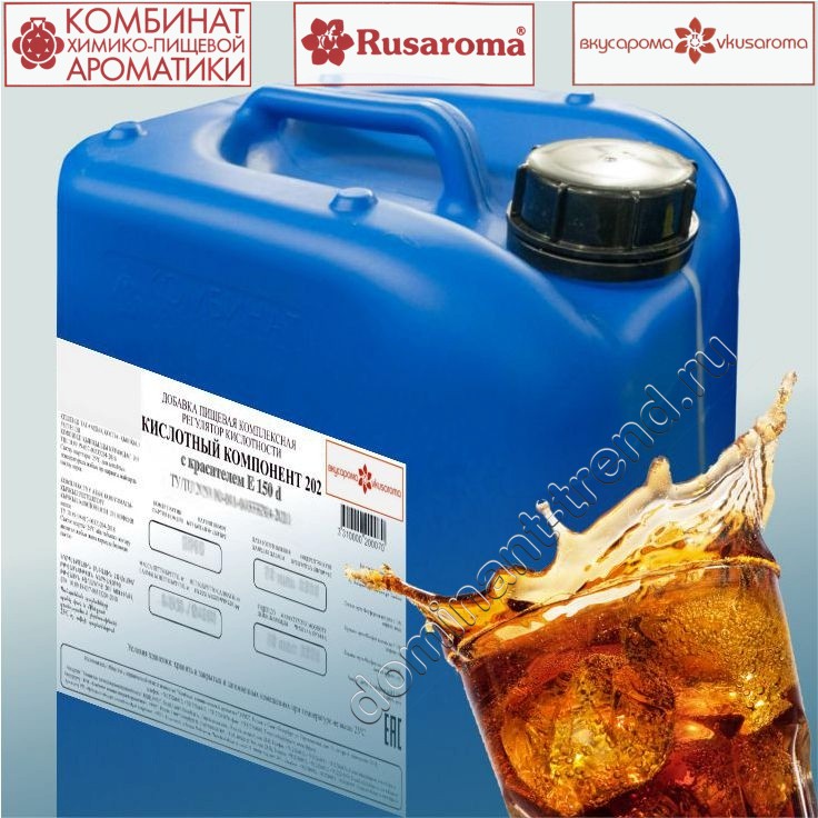 Напитки: Комплексная пищевая добавка, регулятор кислотности (может быть использована вместо лимонной кислоты). Состав: смесь орто-фосфорной кислоты и колера Е150d. Для производства безалкогольных напитков типа “Кола” (используется вместе с ароматизаторами со вкусом колы). Расход: 1,5 кг/т.
